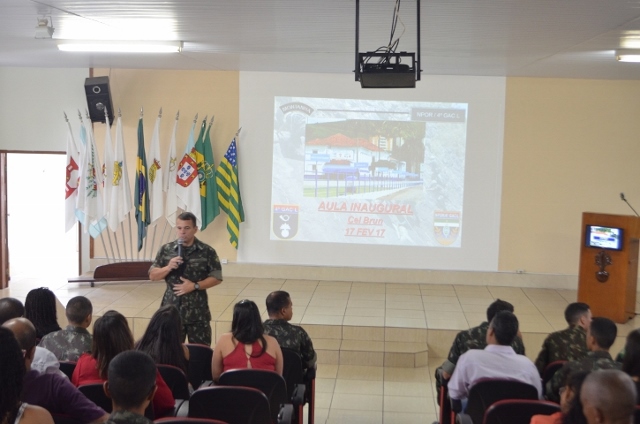 Em seguida, o comandante do Grupo ministrou a aula inaugural aos alunos e familiares, versando sobre o Exército Brasileiro e as atividades que serão desenvolvidas durante o ano de instrução.